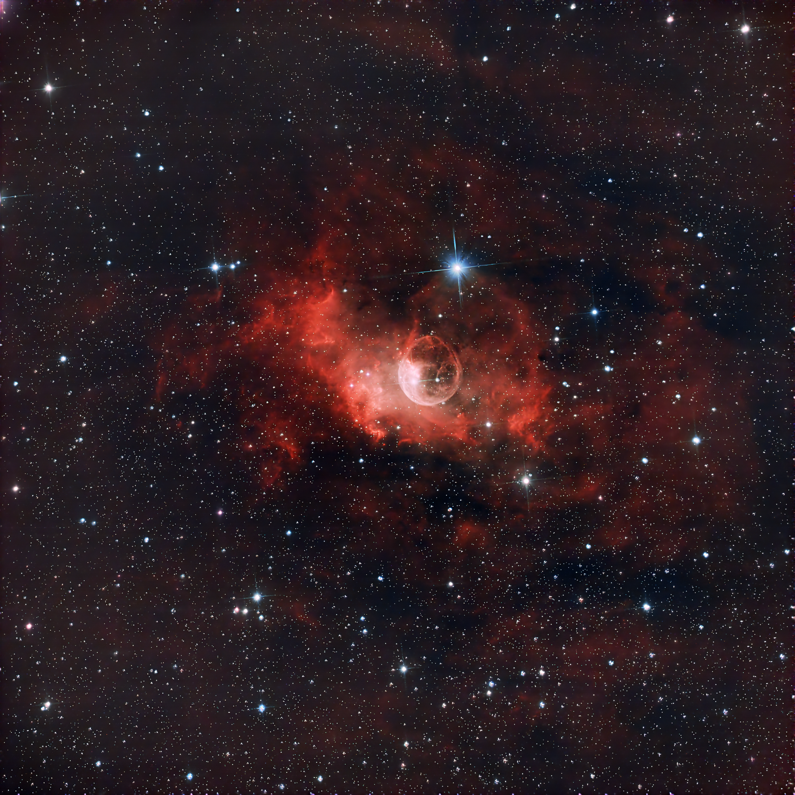 NGC 7635 ou Sh2-162 ou LBN 549 ou Caldwell 11 ou nébuleuse de la Bulle est une nébuleuse en émission (région HII) et une bulle de vent stellaire d’environ 7 al années-lumière (al) de diamètre, située à environ 7 000 al de la Terre, dans la constellation de Cassiopée du bras de Persée de la Voie lactée.