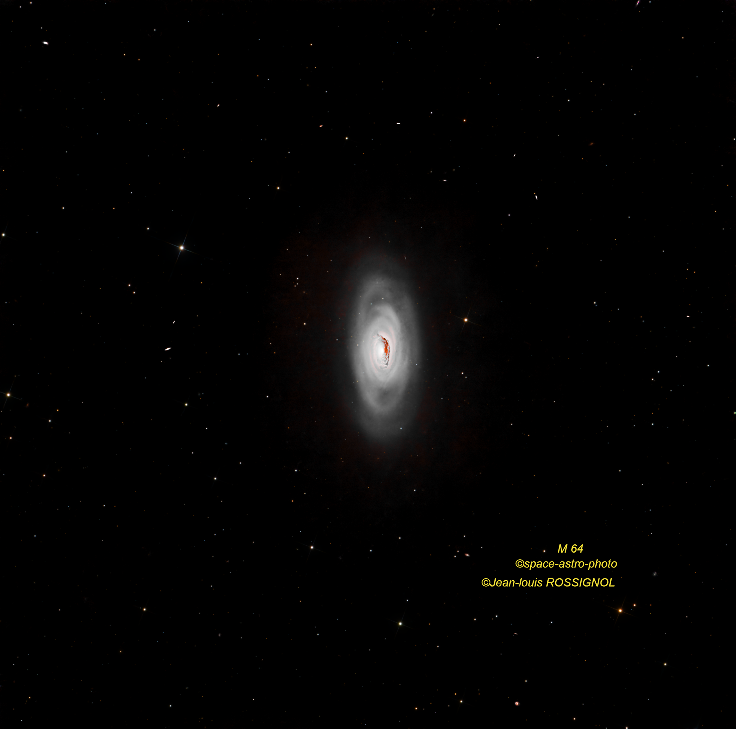 M64 (NGC 4826) est une galaxie spirale située dans la constellation de la Chevelure de Bérénice. M64 est aussi connue sous les noms de galaxie de l’Œil noir, de galaxie de l’Œil poché, de galaxie de l’œil démoniaque ou encore de Beauté endormie.